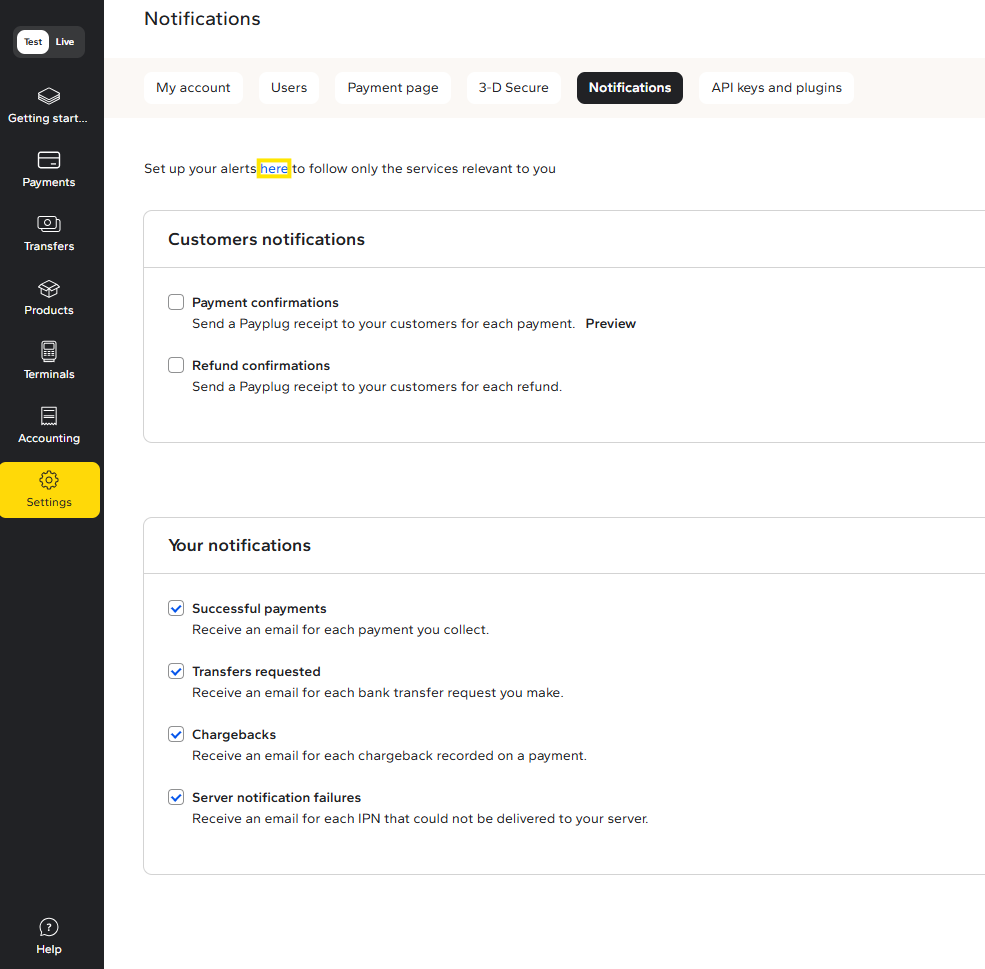 - From the “Settings” section in your Portal menu, go to the “Notifications” tab, then click on the link in “here” of the sentence: “Configure your notifications here to follow only the services that concern you.”
