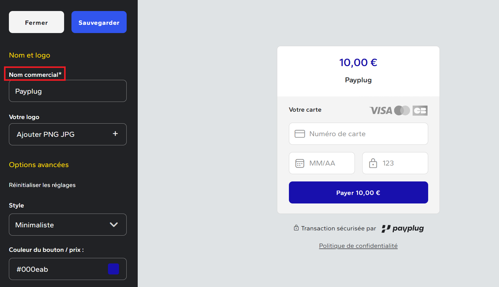 Si vous souhaitez afficher votre logo, cliquez sur "Ajouter" ou "Modifier" pour choisir le fichier approprié depuis votre ordinateur. Ce logo sera de taille maximale 72 pixels de hauteur et 320 de largeur. Si celui que vous chargez est plus grand, il sera redimensionné dans cette taille. Votre logo apparaît ensuite en haut à gauche de la page de paiement.