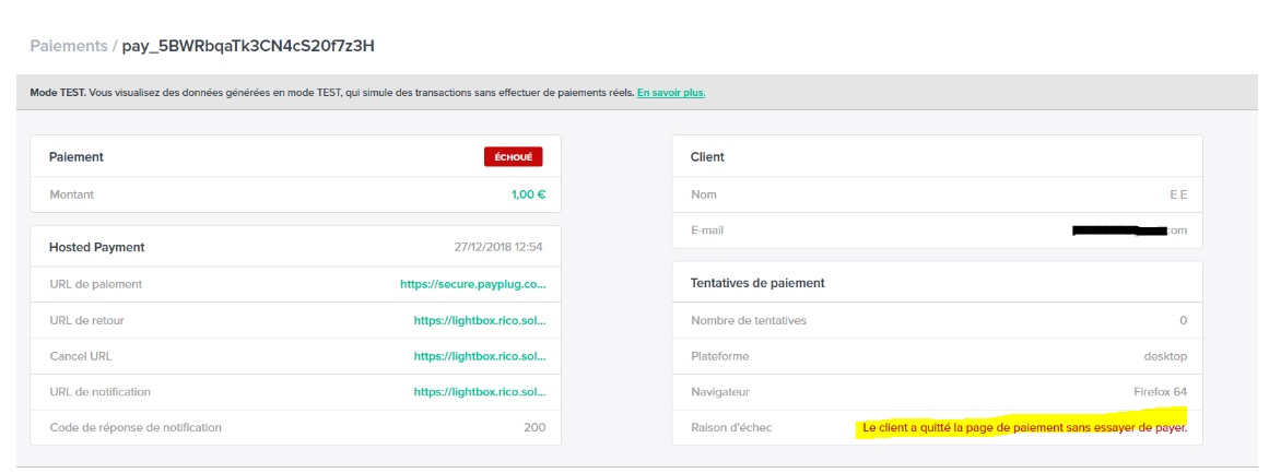 - "Le paiement a été annulé par le client" : Une fois rendu sur la page de paiement, votre client a cliqué sur le bouton « annulé ».