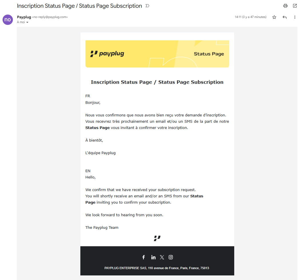 Una volta inviato il modulo, se hai indicato il tuo indirizzo e-mail, riceverai una e-mail di conferma da parte nostra, oltre a una e-mail della Status Page che ti inviterà a confermare la tua iscrizione.